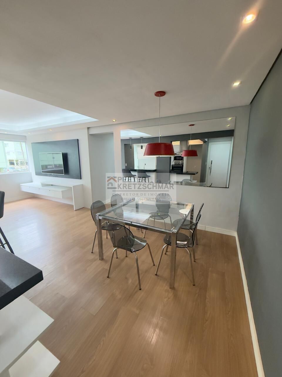 ✅ Amplo living integrado para sala de TV e jantar com TV e painel